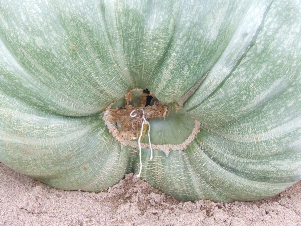 Down goes the 824 Brunst* to BES (Sorry G) . (I didn't want Russ to feel lonely). Final OTT=116+72+74=262"=386 lbs at Day 38. The squash wasn't real aggressive the last couple weeks and had developed two Dill rings. I haven't decided whether I'm going to save the seeds, although I suspect they are mature. It was crossed with the 1055 Pitura*. We had a real nice warm sunny day here today. This may have contributed. I have been concerned about this blossom end for a while as it was growing over on itself.