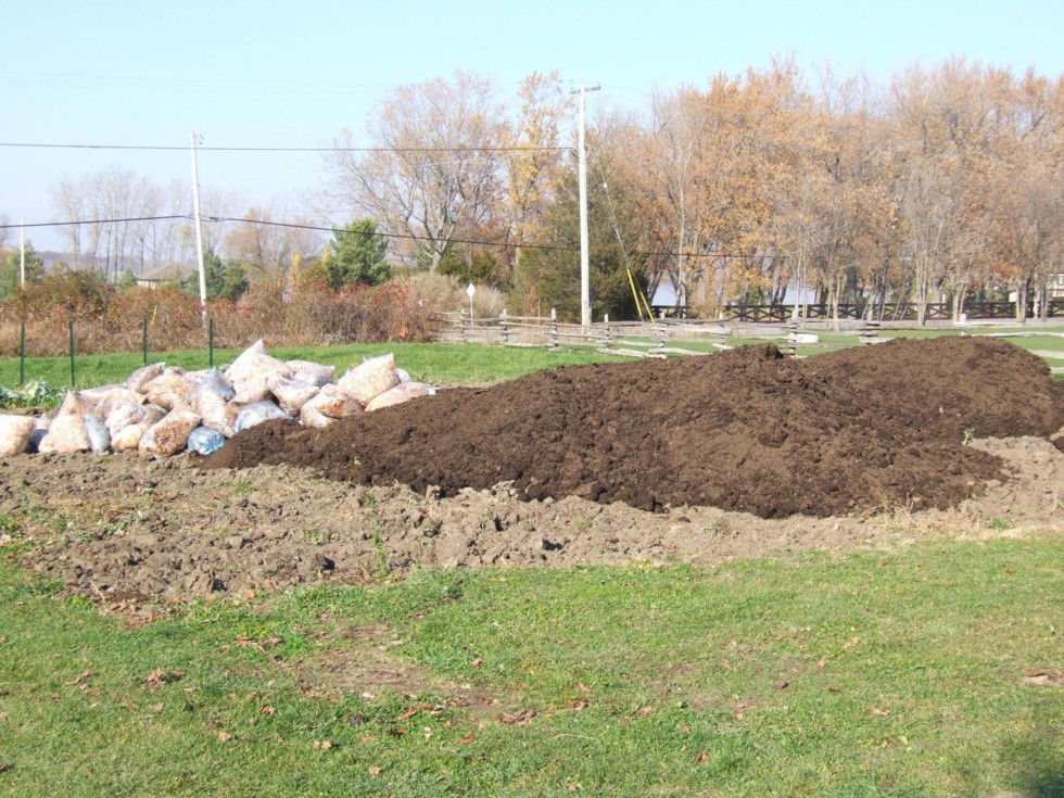 I took the afternoon off work to do a little patch prep. Pictured here is 50 yards of mushroom compost (two tri-axel dump truck loads) and 100 bags of leaves. All the leaves and about 35 yards of compost were spread this afternoon. I set aside about 15 yards for next spring planting mounds, vine covering etc. The plan is to mold board plow the whole thing under in the next couple days.