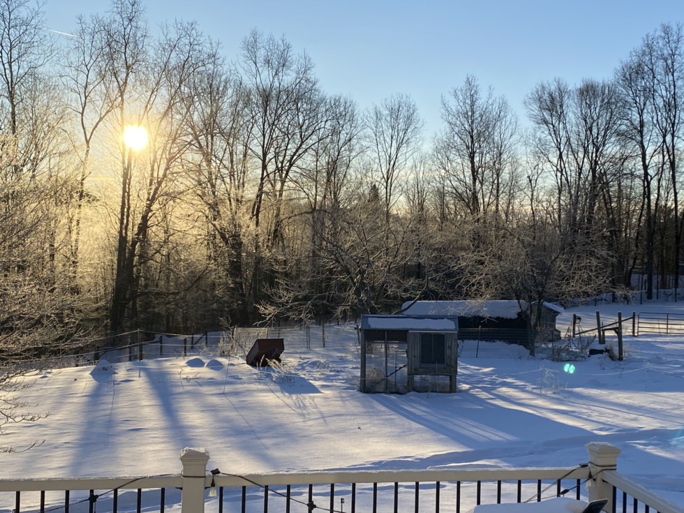 An icy morning scene to wake up to. Moisture must have come up from the creek over night and it formed as ice on the branches. It's been a cold winter so far. It's been several years since we have had a real winter