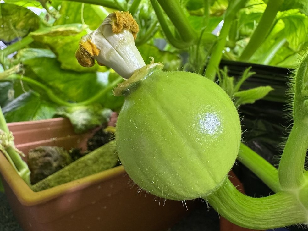 Update on my indoor overwinter Giant Squash project.. She is now DAP 4 in this picture and doesn't show any signs of abortion yet! Hopefully she holds! (1109 Jutras X 2365 Wolf)