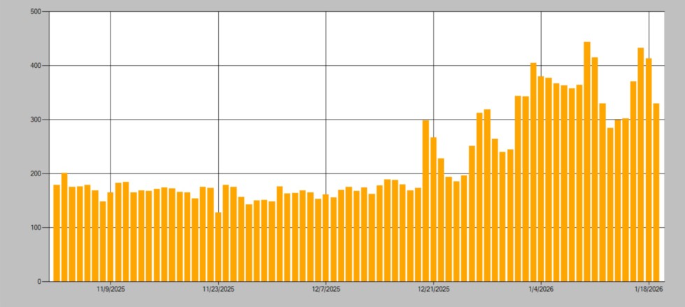 Every year after the weigh-offs are done, website traffic drops off below 200 registered users per day. Then when the seed auction season begins the traffic spikes again. Someone asked, do the week night auctions get as many people as the weekends? Not quite, but they did quite well. This chart shows the total unique registered users per day on BigPumpkins.com. Maybe your club or organization should buy an ad? Contact me if you are interested.