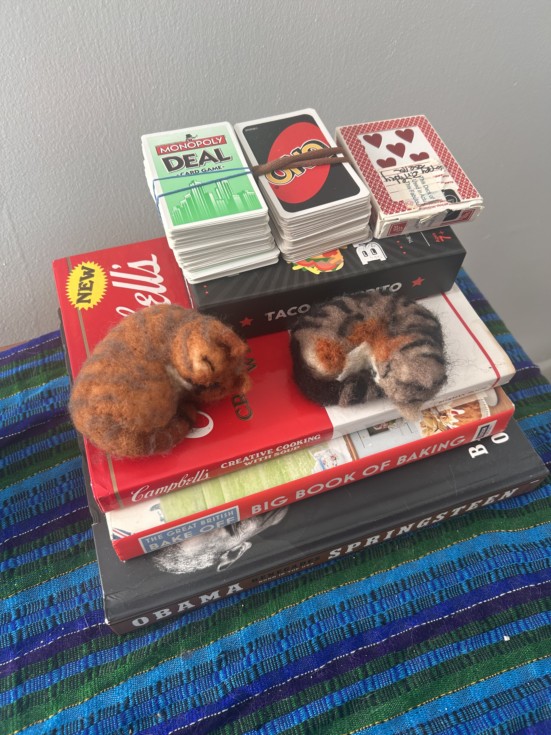 These 2 felted cats were made by Maurice. They are modeled off of my girlfriend's cats and she loved them! He made one more thing but I can't reveal that one yet...