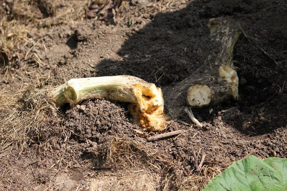 Here you can see the stump. I thought it was a little rot -- a post on the message board alerted me to check for rot where I have cut off leaves too high. As I started scraping I started pulling out larvae. :( There weren't as many as last year, and many of them were still small.